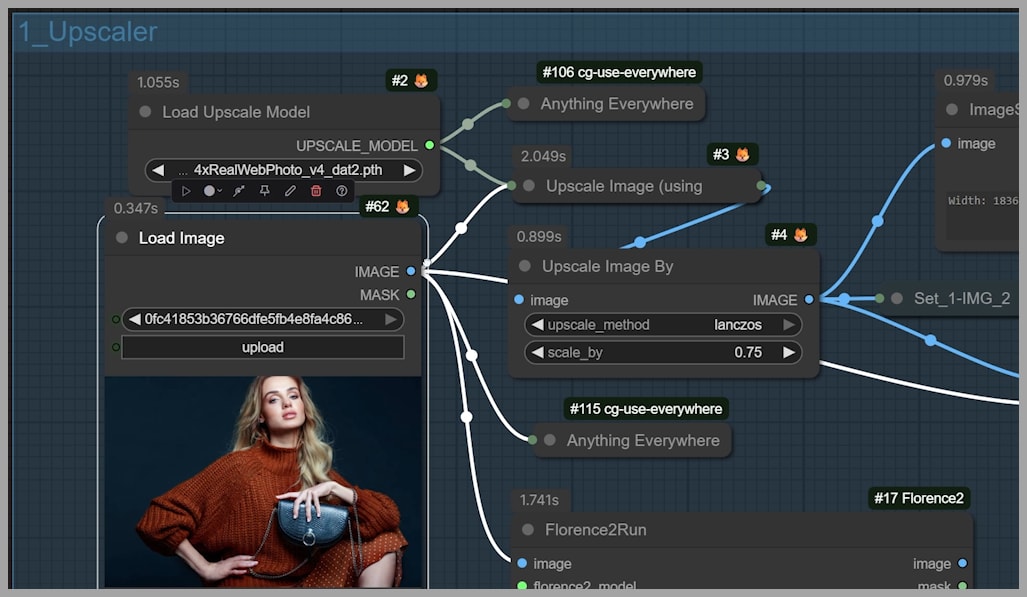 This article walks through a four-stage ComfyUI upscaling workflow I designed specifically for fabrics. We’ll start from a small source (e.g., 612×408) and end with a crisp, realistic result by combining: