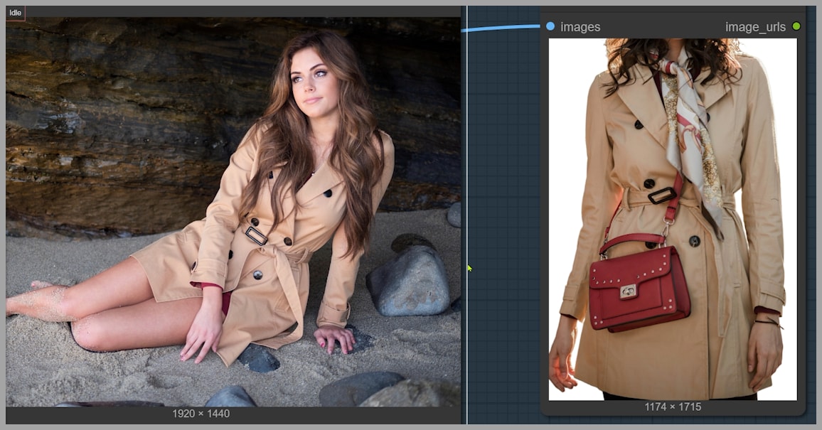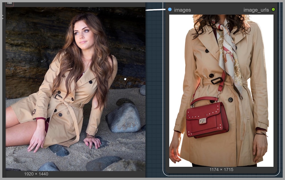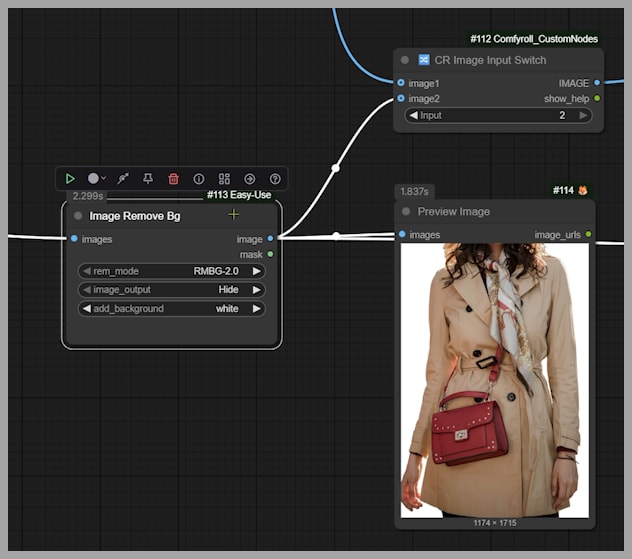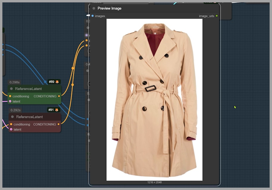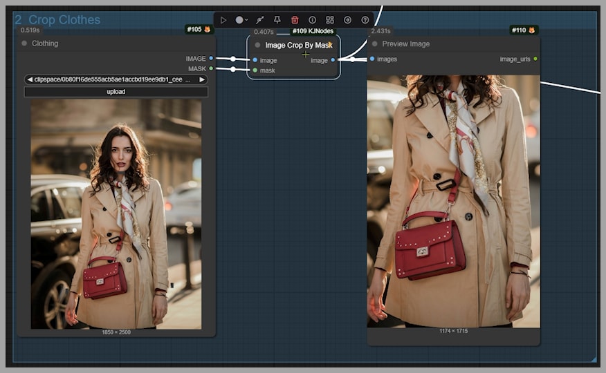 The first step I take is cropping the clothing reference—here, the trench coat—using an “Image Crop By Mask” node.
