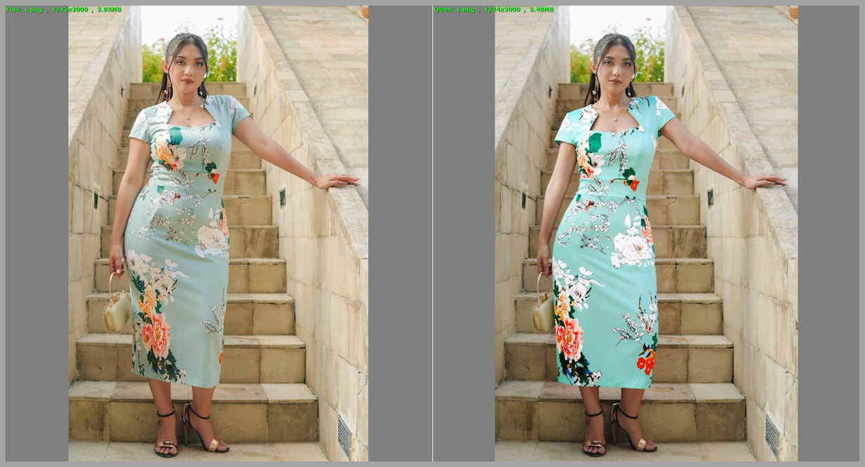 - The dress from Flux 2 Klein looks more dimensional.