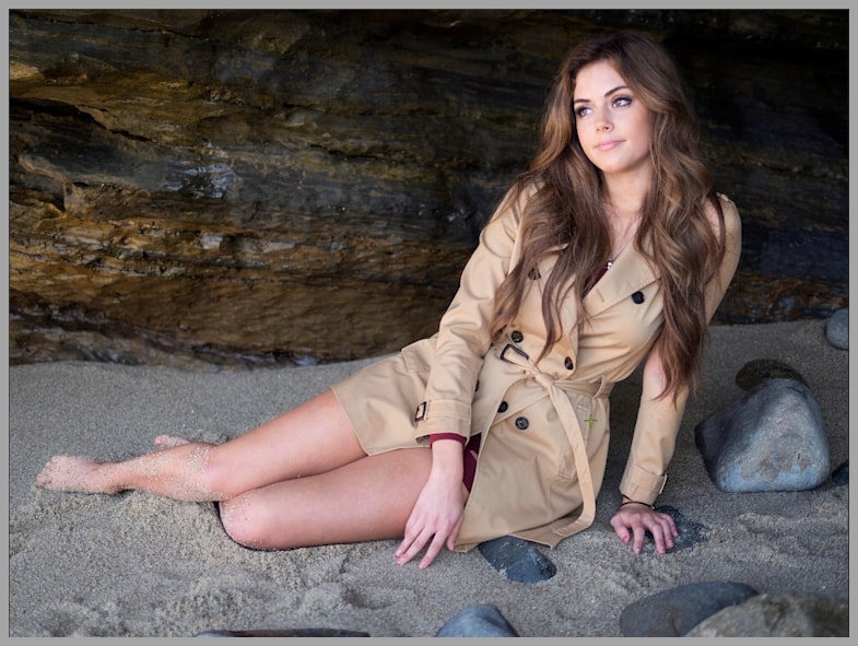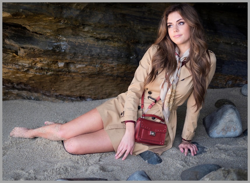 In the trench coat example, the output included a scarf and bag, which looked weird—like, wearing a bag while lying on sand and rocks doesn’t really make sense.