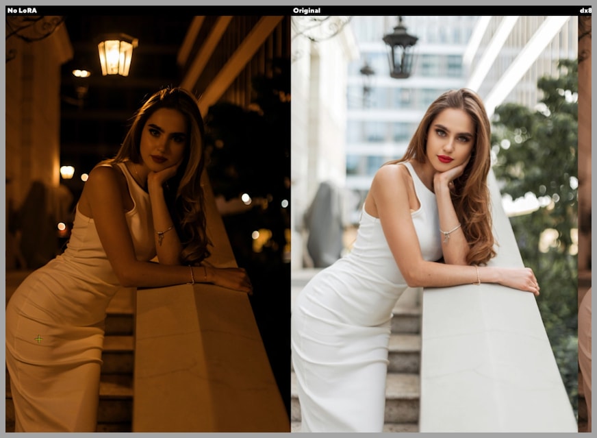Without a LoRA, the model changes too much. The problem is not only the lighting. Even the color of her dress changes, which shows that the model is not simply editing the scene but reinterpreting the image more broadly.
