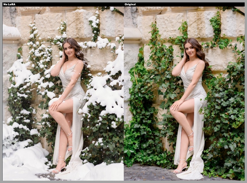 With the LoRAs, the amount of snow becomes easier to manage. Both outputs show better control, but they do not distribute the snow in exactly the same way.