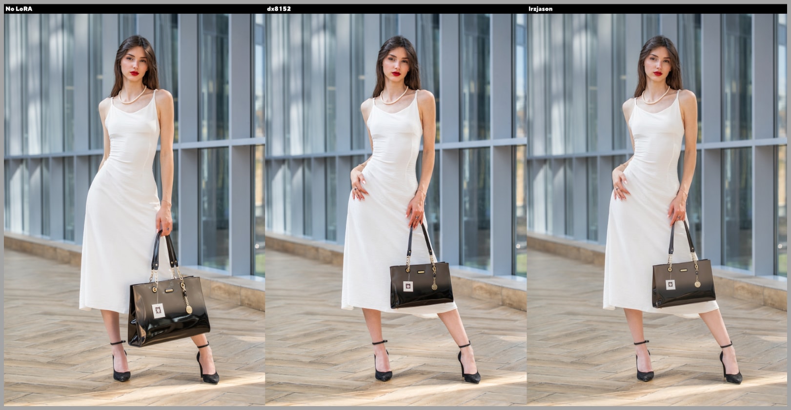 One LoRA-assisted result keeps the hand closer to the original pose. However, it also makes the bag-carrying position feel a little unnatural.