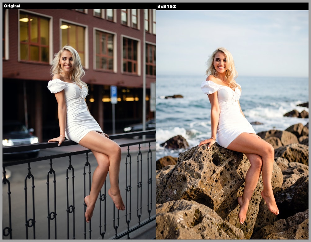 The first example starts with a portrait of a woman sitting on a railing on a street. The goal is to edit the image so she appears sitting on rocks by the sea.