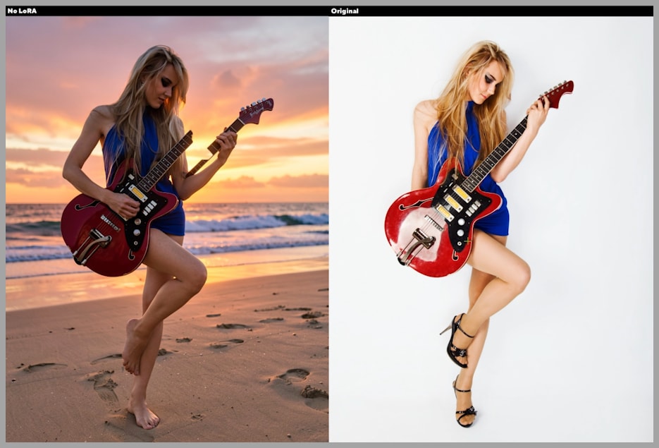 The version generated without a LoRA struggles badly with the complexity of the request. The most obvious issue is that the woman ends up breaking her electric guitar, which shows how poorly the model handles the coordinated change.