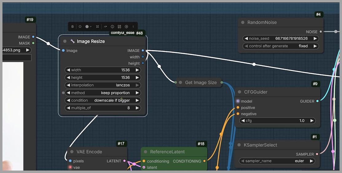 We begin with the standard workflow recommended by the ComfyUI team. The only modification I’ve made is adding an Image Resize node, allowing us to adjust the width and height (e.g., setting them to 2048).