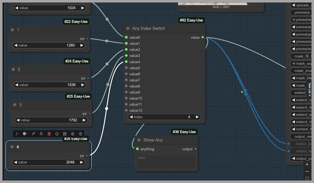In the workflow, crop sizes are saved as preset square options, and you select them using an index.