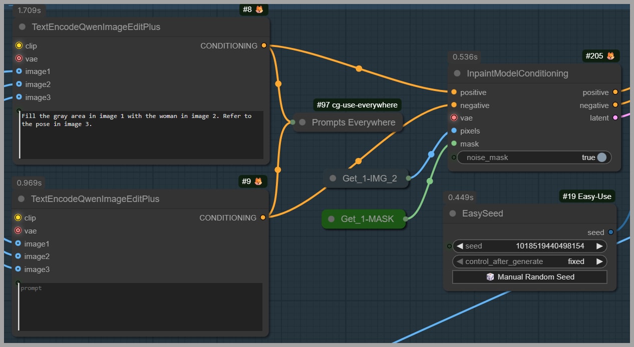 These images are fed into the Qwen Edit model to guide the process of inpainting. The model will fill the gray area in the first image with the head from the second image, while referring to the pose in the third image for proper positioning.