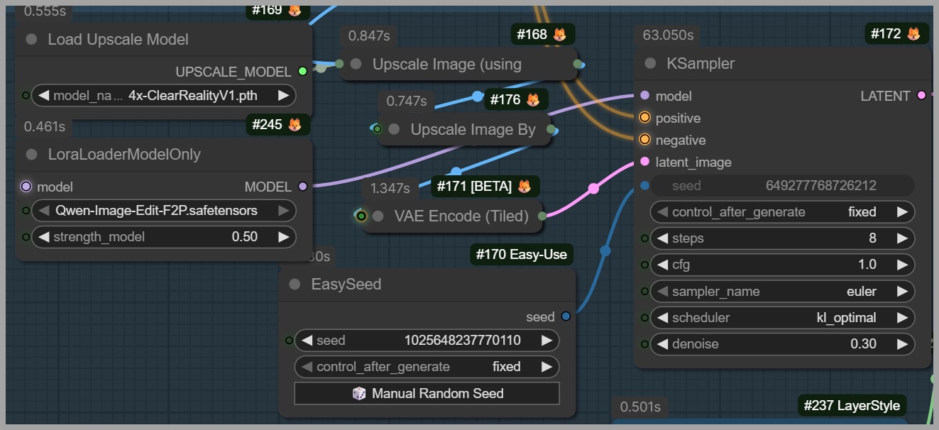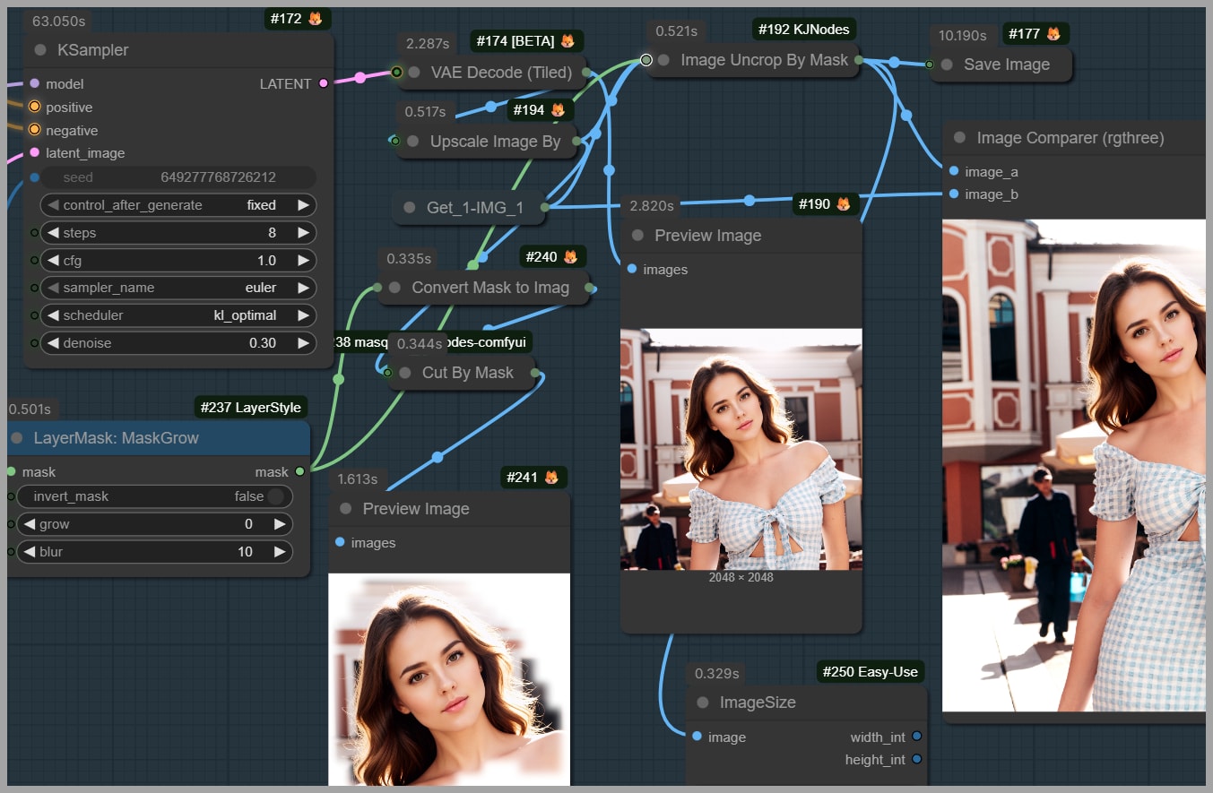 Additionally, I apply the kl_optimal scheduler and adjust the denoising strength to control the degree of change in the image. This helps fine-tune the inpainting process and ensures that the final result is as consistent and natural as possible.