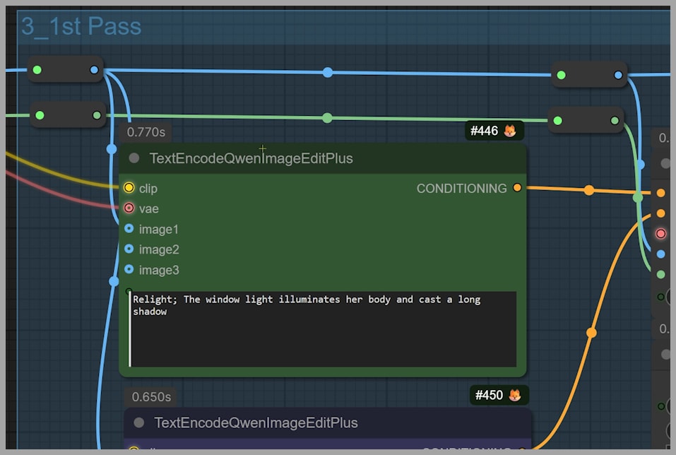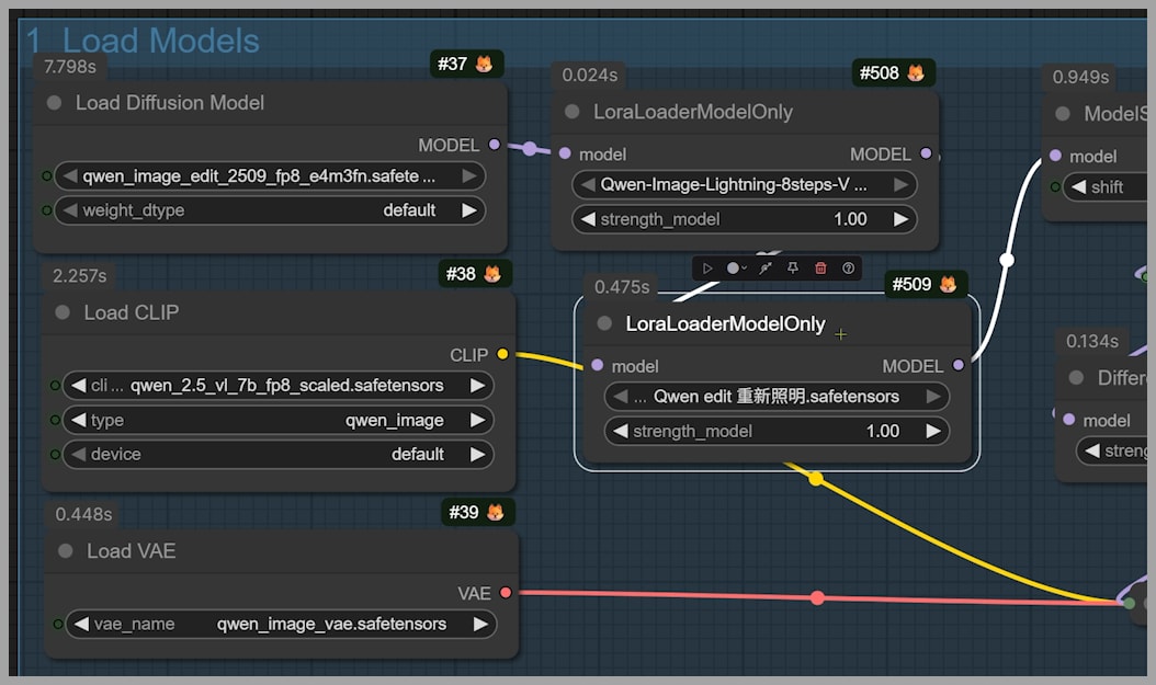 Group 1 — Qwen Edit + Lightning + Relighting LoRA Set up the model stack that understands and applies relighting instructions.
