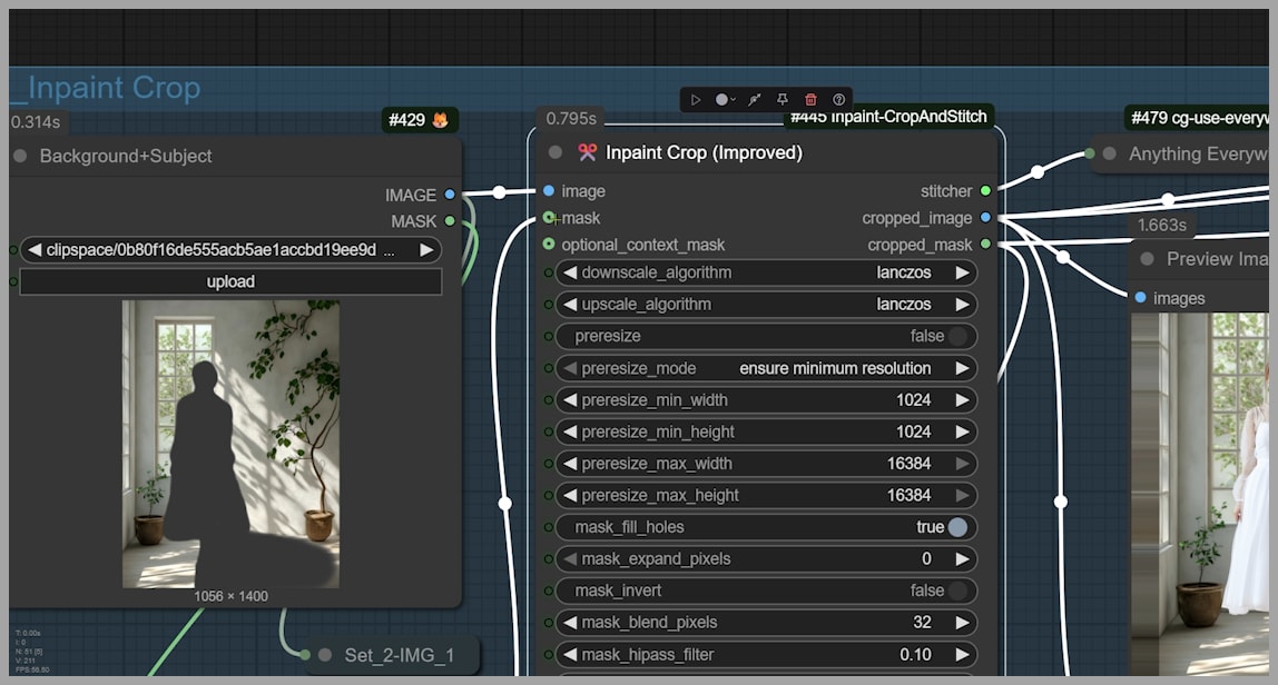 - The node will trim some pixels and pad others to create a square edit canvas while previewing the masked region.