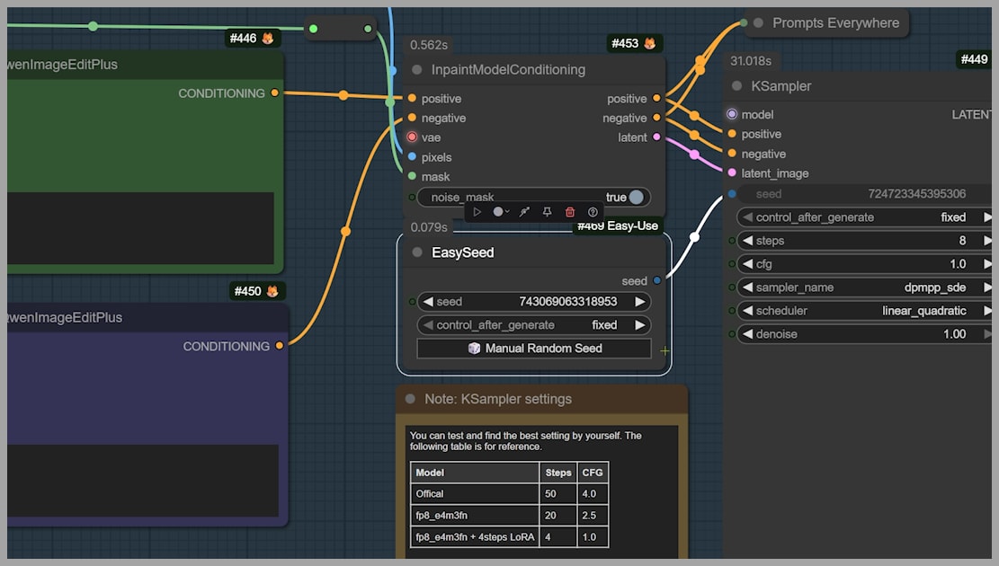 - Lightning LoRA (8-steps) helps the model follow concise prompts reliably.